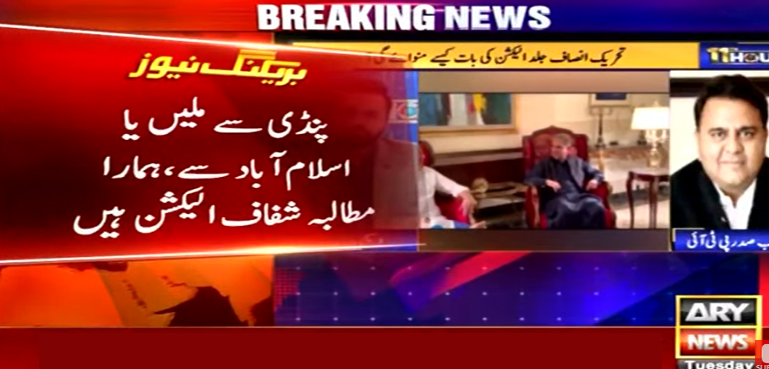 پی ٹی آئی رہنما فواد چوہدری نے کہا ہے ہمارا تو ایک ہی مطالبہ ہے فوری نئے انتخابات کا اعلان کریں اب یہ پنڈی سے ملیں یا اسلام آباد سے۔