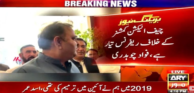 اے آر وائی نیوز کے مطابق پاکستان تحریک انصاف کے رہنما اور سابق وفاقی وزیر فواد چوہدری نے میڈیا سے گفتگو کرتے ہوئے کہا ہے کہ چیف الیکشن کمشنر کے خلاف جوڈیشل ریفرنس تیار ہوگیا۔ ریفرنس واپس لینے کا کوئی فیصلہ نہیں ہوا بلکہ اس کے ساتھ ثبوت منسلک کیے جارہے ہیں۔