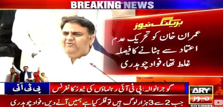 اے آر وائی نیوز کے مطابق فواد چوہدری نے گوجرانوالہ میں پریس کانفرنس کرتے ہوئے کہا کہ عمران خان کو ہٹانے کا فیصلہ غلط اور غیر مقبول تھا ضمنی انتخابات میں 75 فیصد سے زائد پی ٹی آئی کامیاب ہوئی ہے، عمران خان کو عدم اعتماد کے ذریعے باہر کرنے کے فیصلے کو درست کرنے کا وقت آگیا ہے، اب پاکستان میں عوام کی اکثریت جو فیصلہ کریگی وہی حتمی ہوگا، ہمارا مطالبہ ہے شفاف الیکشن کرائیں اور عوام کو فیصلہ کرنے دیں۔