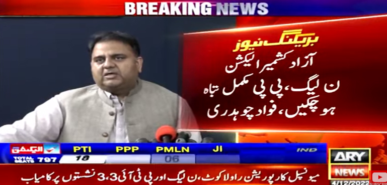 اے آر وائی نیوز کے مطابق آزاد کشمیر میں گزشتہ ہفتے بلدیاتی انتخابات کے پہلے مرحلے کے نتائج اور گزشتہ روز ہونے والے دوسرے مرحلے میں چار اضلاع میں انتخابی نتائج آنے کے بعد پی ٹی آئی کے مرکزی سیکریٹری اطلاعات فواد چوہدری نے سماجی رابطوں کی ویب سائٹ ٹوئٹر پر اظہار خیال کیا ہے۔