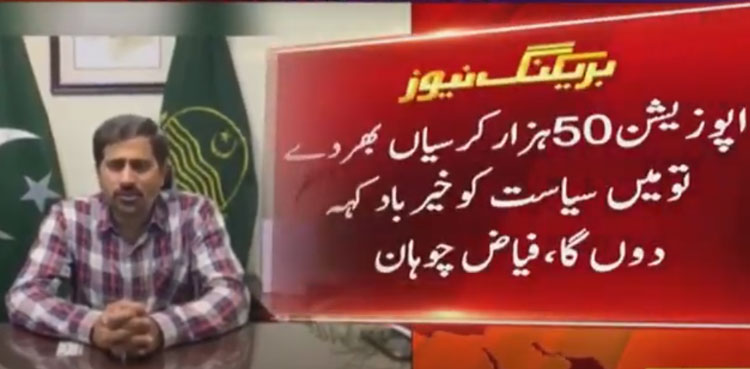 لاہور: پنجاب کے وزیربرائے جیل خانہ جات فیاض الحسن چوہان نے پاکستان ڈیموکریٹک موومنٹ کو چیلنج کیا ہے کہ جلسے میں 50 ہزار لوگ لے آئیں سیاست چھوڑ دوں گا۔