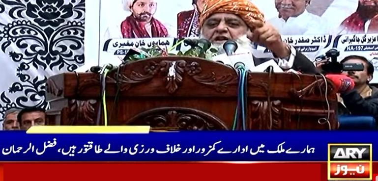 اے آر وائی نیوز کے مطابق جمعیت علمائے اسلام کے سربراہ مولانا فضل الرحمان نے انتخابات کے سلسلے میں لاڑکانہ میں جلسہ عام سے خطاب کرتے ہوئے کہا ہے کہ پاکستان تنزلی کی اتنہا پر ہے، کہیں نہ کہیں تو کوئی خرابی موجود ہے۔