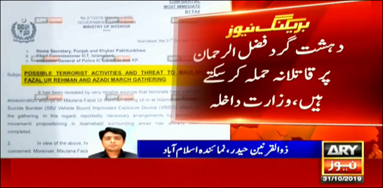قبل ازیں وزارت داخلہ نے 25 اکتوبر کو الرٹ جاری کیا تھا کہ دہشت گردتنظیمیں آزادی مارچ کو نشانہ بناسکتی ہیں، دشمن ایجنسیوں نے مولانا فضل الرحمان اور دیگر قائدین کو نشانہ بنانے کے لیے ایک لاکھ ڈالر دہشت گردوں میں تقسیم کیے۔