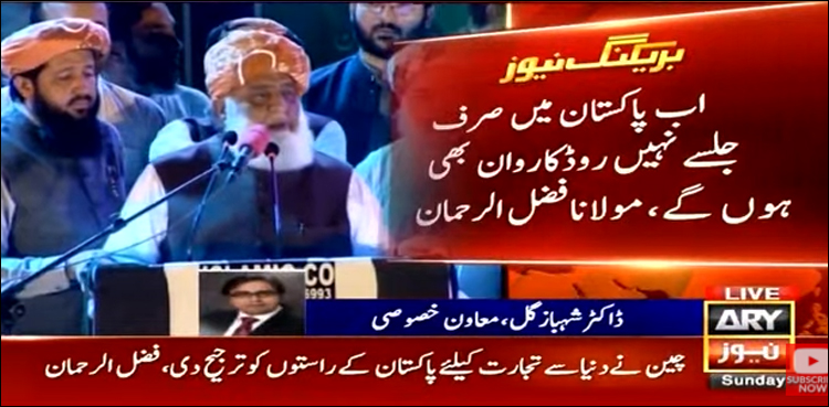 فضل الرحمان نے کہا کہ سی پیک عالمی قوتوں کوبرداشت نہیں ہوا، چین نےدنیاسےتجارت کیلئے پاکستان کے راستوں کو ترجیح دی،سی پیک دنیا کے دیگرممالک کو ہضم نہیں ہوا، عمران خان نے امریکا کے خلاف ایک جملہ بھی ادا نہیں کیا، وزیراعظم بن کر پاکستان کی معیشت کو زمین بوس کیا اور عالمی دنیا میں پاکستان کو تنہا کردیا‘۔