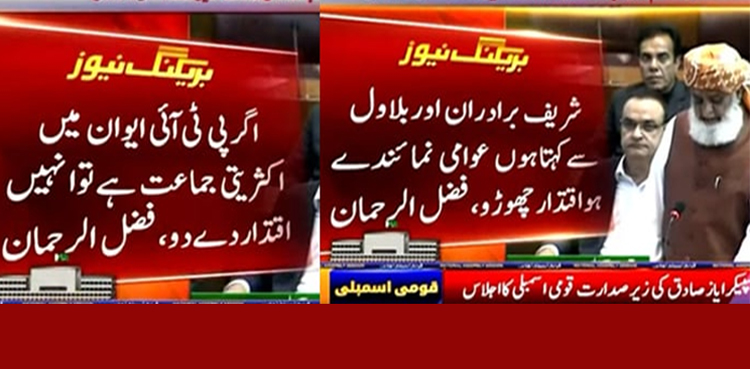 جمعیت علما اسلام ف کے سربراہ مولانا فضل الرحمان نے حکمران جماعتوں کو مشورہ دیا ہے کہ اگر تحریک انصاف اکثریتی جماعت ہے تو اقتدار اس کے سپرد کریں۔