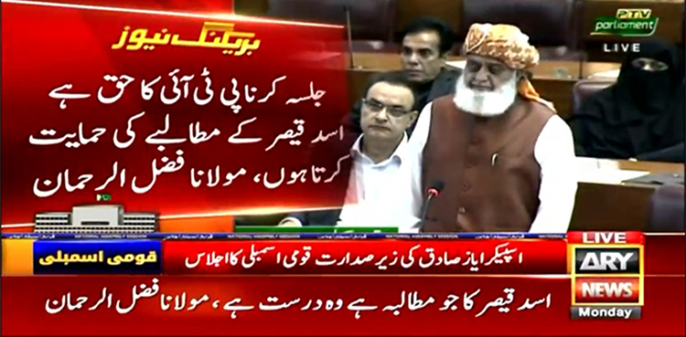 قومی اسمبلی اجلاس میں اظہارخیال کرتے ہوئے مولانافضل الرحمان نے کہا کہ اس باراسمبلیاں خریدی اور بیچی گئیں ہمارا ضمیر کس طرح اس ایوان میں بیٹھنے پر مطمئن ہیں ہارنے والے پریشان اور جیتنےوالے بھی مطمئن نہیں اس کیفیت میں حکومت میں بیٹھنےوالی جماعتیں ہمارے ہم سفر رہے ہیں ہم ان جماعتوں کی قدر کرتے ہیں جو حکومت میں ہیں اس جماعت کے سینئر لوگ مجبور ہیں کہ وہ اپنےمینڈیٹ پر اعتراض کر رہے ہیں۔
