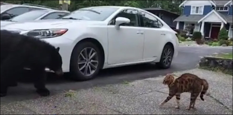 ریچھ کے وہم و گمان بھی نہیں تھا کہ ڈرائیو وے میں اس کا سامنا کسی اور چیز سے نہیں بلکہ صرف ایک بلی سے ہوگا، ایک گھریلو بلی، لیکن اس کے خطرناک تیور دیکھ کر ریچھ کے بھی اوسان خطا ہو گئے۔