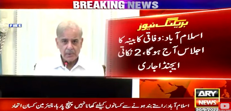 اے آر وائی نیوز کے مطابق وفاقی کابینہ کا اجلاس آج وزیراعظم شہباز شریف کی زیر صدارت ہوگا جس کا دو نکاتی ایجنڈا جاری کردیا گیا ہے۔