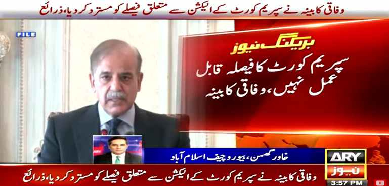اے آر وائی نیوز کے مطابق وفاقی کابینہ نے سپریم کورٹ کی جانب سے پنجاب میں الیکشن کے حوالے سے سنائے گئے فیصلے کو مسترد کرتے ہوئے کہا ہے کہ سپریم کورٹ کا فیصلہ اقلیتی ہے جو قابل عمل نہیں ہے۔