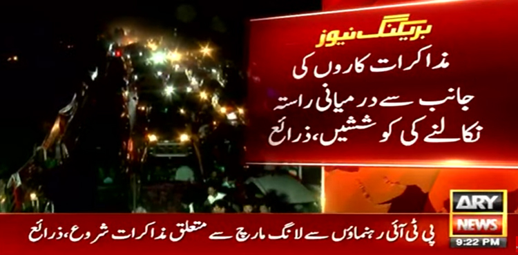 ذرائع کے مطابق مذاکرات کاروں کی جانب سے درمیانی راستہ نکالنے کی کوششیں کی گئیں تاہم چیئرمین پی ٹی آئی عمران خان لانگ مارچ مکمل کرنے کے حق میں ہیں۔