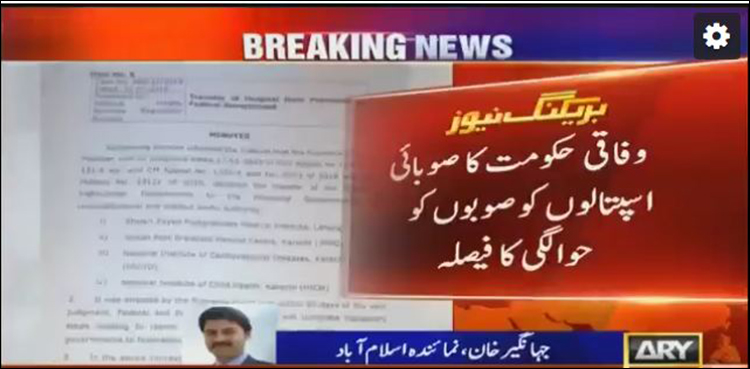 اسپتالوں کی صوبوں کوحوالگی کافیصلہ وفاقی کابینہ نےکیا، وفاقی کابینہ کامؤقف ہے کہ وفاق موجودہ مالی حالات میں اسپتالوں کاانتظام نہیں سنبھال سکتا، جناح اسپتال، ادارہ برائے امراض قلب ، ادارہ برائے امراض اطفال کو بجٹ مختص کیے بغیر چلانا ممکن نہیں۔