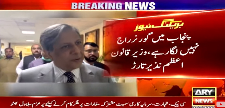 وزیر قانون سینٹر اعظم نذیر تارڑ نے کہا ہے کہ پنجاب میں گورنر راج نہیں لگا رہے لیکن رانا ثنا اللہ نے کہا ہے اگر وزرا کے داخلے پر پابندی لگائی تو جواز فراہم کریں گے۔