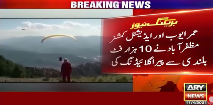 اے آر وائی نیوز کی رپورٹ کے مطابق وفاقی وزیر توانائی عمر ایوب اور ایڈیشنل کمشنر مظفرآباد نے 10 ہزار فٹ بلندی سے پیرا گلائیڈنگ کی، انہوں نے پیر چناسی سے پیراگلائیڈںگ کی اور مظفرآباد ایئرپورٹ پر لینڈ کیا۔