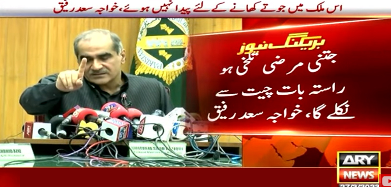اے آر وائی نیوز کے مطابق وفاقی وزیر ریلوے سعد رفیق نے لاہور میں پریس کانفرنس کرتے ہوئے کہا ہے کہ پارلیمنٹ تب مضبوط ہوگی جب سیاسی جماعتیں بات چیت کریں گی۔ سیاستدان پارلیمنٹ پر حملے کریں گے تو حقیقی جمہوریت نہیں آئے گی۔ تلخی کتنی ہی کیوں نہ ہو راستہ بات چیت سے ہی نکلے گا لیکن اس کیلیے ماحول بنانا پڑے گا اور ماحول اس کو بنانا پڑے گا جو زیادتی کرتا اور جھوٹ بولتا ہے۔