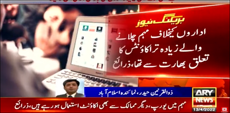 ایف آئی اے ذرائع کا یہ کہنا ہے کہ اداروں کے خلاف مہم چلانے والے زیادہ تر اکاؤنٹس کا تعلق بھارت سے تھا، اداروں کے خلاف مہم میں یورپ اور دیگر ممالک سے بھی اکاؤنٹ استعمال ہو رہے ہیں۔