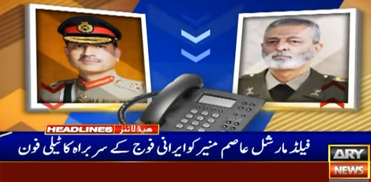ایرانی میڈیا کے مطابق فیلڈ مارشل کو ایرانی چیف آف اسٹاف میجر جنرل عبدالرحیم موسوی نے فون کیا اور امریکا و اسرائیل جنگ میں ساتھ کھڑے ہونے پر پاکستان کا شکریہ ادا کیا۔