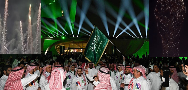 فیفا کی جانب سے فٹبال ورلڈ کپ 2034 کی میزبانی ملنے پر سعودی عرب میں سرکاری سح پر ملک گیر جشن منایا گیا۔ اس کھیل کے دیوانے فینز سڑکوں پر نکل آئے اور ہلہ گلہ کر کے جشن منایا۔ اس موقع پر شاندار آتشبازی سے آسمان رنگ ونور سے نہا گیا جب کہ ڈرون شو کا بھی مظاہرہ کیا گیا۔