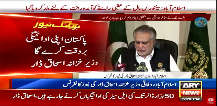 تفصیلات کے مطابق اسلام آباد میں پریس کانفرنس کرتے ہوئے وزیر خزانہ نے کہا کہ آئی ایم ایف کے پروگرام کی پاسداری کریں گے، اگلے ہفتے پچاس ہزار ڈالرز تک کہ ایل سیز کی ادائیگیاں کرنے جارہے ہیں جس کیلئے اسٹیٹ بینک نے ڈیٹا فراہم کردیا ہے۔