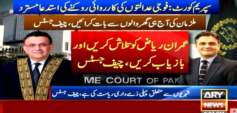 چیف جسٹس عمر عطا بندیال نے فوجی عدالتوں میں سویلینز کے ٹرائل سے متعلق کیس کی سماعت کے دوران اٹارنی جنرل کو ہدایت کی ہے کہ صحافی عمران ریاض کو تلاش کرکے بازیاب کرائیں۔