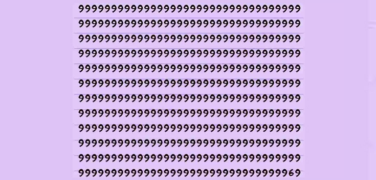 ہلکے جامنی رنگ کی بورڈ نما تصویر پر قطار در قطار آپ کو 9 کا ہندسہ لکھا نظر آئے گا اس میں آپ نے وہ ہندسہ تلاش کرنا ہے جو اس بھیڑ میں کہیں گم ہوگیا ہے لیکن گھل مل جانے کے باعث اس کی تلاش آسان نہیں ہوگی لیکن دنیا میں کوئی چیز ممکن بھی نہیں صرف محنت ہی بظاہر ناممکن نظر آنے والی چیز کو ممکن بناتی ہے تو اپنی پوری توجہ اس پر مرکوز کریں ہمیں یقین ہے کہ آپ کو محنت کا پھل مل جائیگا۔