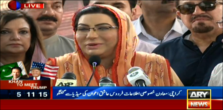تفصیلات کے مطابق معاون خصوصی برائے اطلاعات فردوس عاشق اعوان نے کراچی پریس کلب میں میڈیا سے گفتگو کرتے ہوئے کہا پاکستان  کے مثبت امیج کو اجاگر کرنے کیلئے آج وزیراعظم اور امریکی صدر کی اہم ملاقات ہونے جارہی ہے ، آج پاکستان دشمنوں کی سازشیں دم توڑنے جارہی  ہیں ، پاکستان کے  بیانیے کو کمزور کرنے والی سازشوں کو کل اندازہ ہوگیا ہوگا۔