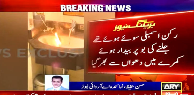 رکن اسمبلی کو پانی پھیک کر آگ بجھانے کی کوشش کے دوران کرنٹ بھی لگا ، رکن اسمبلی دھویں سے بھرے کمرے میں اسمبلی کارڈ ڈھونڈنے بھاگ پڑے۔