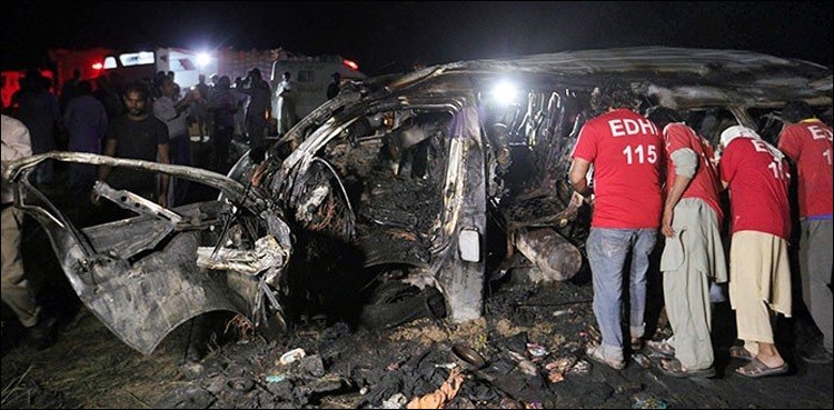 کراچی: دو دن قبل سپر ہائی وے پر نوری آباد کے قریب حیدر آباد سے کراچی آنے والی وین میں آگ لگنے سے جاں بحق ہونے والوں کی تعداد آج 18 ہو گئی ہے۔