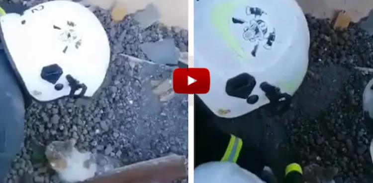 ویڈیو میں دیکھا جاسکتا ہے کہ بلی ملبے کے ڈھیر میں دبی ہوئی ہے اور ریسکیو اہلکار اسے وہاں سے نکالنے کی کوشش کررہے ہیں۔