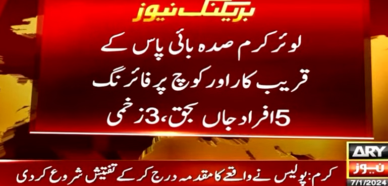 صوبہ خیبر پختونخوا میں لوئر کرم صدہ شہر کے قریب کار اور مسافر کوچ پر نا معلوم مسلح افراد نے فائرنگ کی جس کے نتیجے میں 5 افراد جاں بحق اور تین زخمی ہو گئے۔