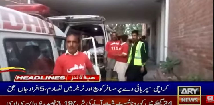 تفصیلات کے مطابق کراچی میں نوری آباد کے قریب میں مسافر بس اورٹریلرمیں خوفناک تصادم ہوا، جس کے نتیجے میں 5افرادجاں بحق اور 20زخمی ہوگئے۔