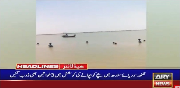 ٹھٹھہ: سندھ کے شہر ٹھٹھہ کے نواحی علاقے کی رہائشی 3 خواتین اور 2 بچے دریائے سندھ میں ڈوب کر جاں بحق ہوگئے۔