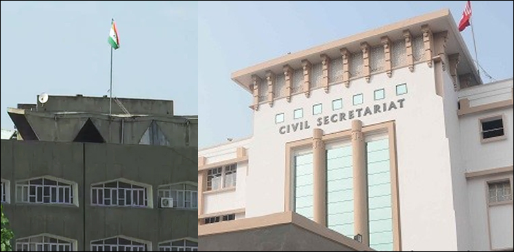 سری نگر: بھارت کے زیر تسلط کشمیر میں بھارت کے عزائم کھل کر سامنے آنے لگے ہیں، جموں میں سیکریٹریٹ کی عمارت سے کشمیر کا پرچم اتار دیا گیا۔