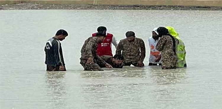 بلوچستان کے مختلف اضلاع میں موسلادھار بارشوں کے بعد پاک فوج کا ریسکیو آپریشن جاری ہے اور مقامی لوگوں کو محفوظ مقامات پر منتقل کیا جا رہا ہے۔