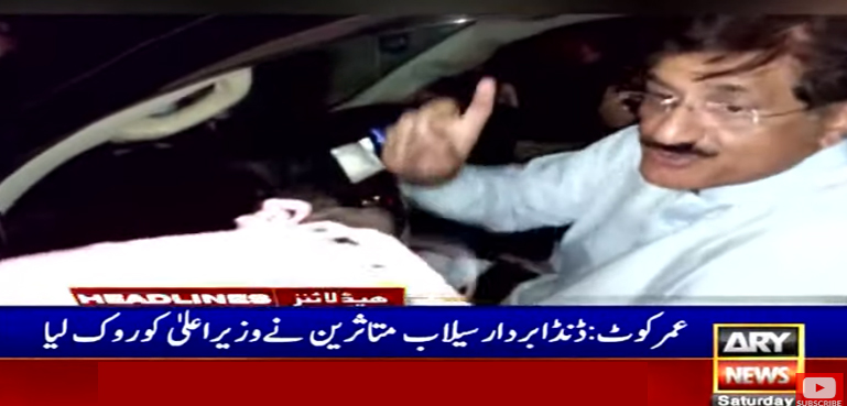 اے آر وائی نیوز کے مطابق وزیراعلیٰ سندھ مراد علی شاہ عمر کوٹ کے سیلاب متاثرہ علاقوں کے دورے کے دوران متاثرین کے ریلیف کیمپ اور ٹینٹ سٹی کا دورہ کیا جہاں امداد سے محروم مشتعل ڈنڈا بردار سیلاب متاثرین اور خواتین نے وزیراعلیٰ کو روک لیا اور ان کی گاڑی کا گھیراؤ کرلیا۔