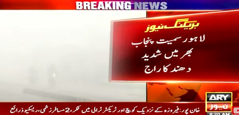 اے آر وائی نیوز کے مطابق لاہور سمیت پنجاب بھر میں شدید دھند کا راج برقرار ہے جس نے شہریوں کے معمولات زندگی درہم برہم کردیے ہیں۔ فلائٹ آپریشن بھی جزوی طور پر متاثر ہے جب کہ دھند کے باعث روڈ حادثات میں کئی افراد زخمی ہوگئے ہیں۔