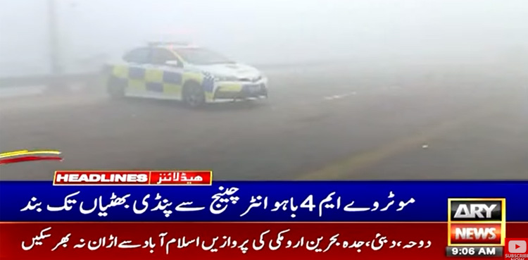 ترجمان موٹر وے پولیس کے مطابق موٹروے ایم 1، پشاور سے اسلام آباد تک ٹریفک کیلیے بند کردیا گیا ہے جبکہ شدید دھند کے باعث سوات ایکسپریس وے کرنل شیر خان سے اسماعیلیہ تک بند ہے۔
