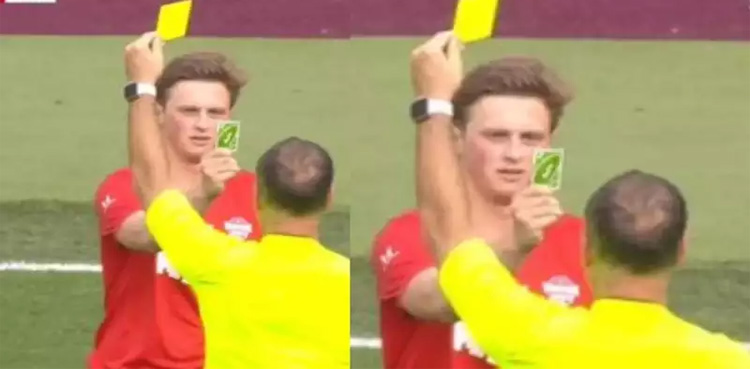 فٹبال میچ کے دوران ایک عجیب و غریب واقعہ پیش آیا جب یلو کارڈ دکھانے پر پلیئر نے ہی ریفری کو یو این او ریورس کارڈ دکھا کر شائقین کو حیرت زدہ کردیا۔