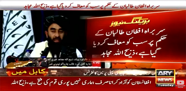 ترجمان طالبان ذبیح اللہ مجاہد نے سورۃ الفتح کےساتھ پریس کانفرنس کا آغاز کرتے ہوئے کہا کہ ‏سب گواہ ہیں افغانستان20 برس تک طویل جنگ کےبعد آزاد کرا لیا ہے افغانستان کو آزاد کرانا ‏صرف ہماری نہیں پوری قوم کی فتح ہے آزادی ہرقوم کابنیادی حق ہوتا ہے سخت مزاحمت ‏کےبعدقابضین کونکالنےمیں کامیاب ہوئے۔