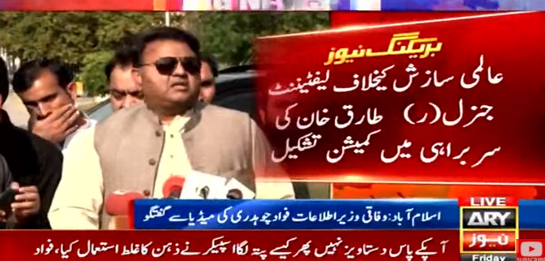 وفاقی وزیر اطلاعات ونشریات فواد چوہدری نے جمعے کے روز میڈیا سے گفتگو کرتے ہوئے بتایا ہے کہ عالمی سازش کیخلاف لیفٹیننٹ جنرل(ر) طارق خان کی سربراہی میں کمیشن تشکیل دیدیا گیا ہے جو دھمکی آمیز لیٹر کی تحقیقات کریگا۔