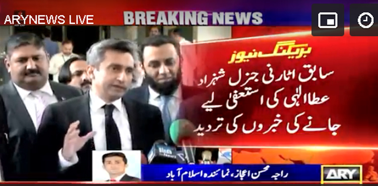 گذشتہ روز اٹارنی جنرل پاکستان شہزاد عطاء الہٰی نے عہدے سے استعفا دے دیا تھا ، ذرائع کا کہنا تھا کہ بیرسٹر شہزاد سے کچھ اہم وجوہات کی بنا پر استعفیٰ دیا ہے۔