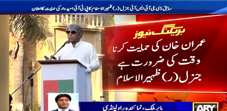 ظہیر الاسلام نے پی ٹی آئی امیدوار کیلئے باقائدہ الیکشن مہم شروع کرتے ہوئے کہا کہ عمران خان کی حمایت کرنا وقت کی ضرورت ہے۔