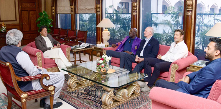 کھلاڑیوں نے وزیراعظم سے پاکستان کرکٹ پر تبادلہ خیال کیا، ملاقات میں پی ایس ایل اور پاکستان میں کرکٹ کی بحالی پر بھی گفتگو ہوئی، وزیر اعظم عمران خان اور ویون ریچرڈز نے اپنے دور کی کرکٹ کی یاد بھی تازہ کی۔