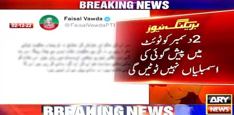 فیصل واوڈا نے دو دسمبر کے ٹوئٹ میں پیش گوئی کی تھی کہ ’سر آپ کے حکم اور خواہش کے مطابق نہ تو پنجاب اسمبلی ٹوٹتی نظر آرہی ہے اور نہی ہی کے پی حکومت ٹوتتی نظر آرہی ہے۔‘