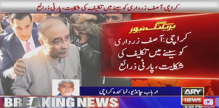 ذرائع کے مطابق سابق صدر کو سینے میں تکلیف کی شکایت ہوئی جس پر ڈاکٹرز کی ٹیم کو فوری طور پر بلاول ہاؤس طلب کیا گیا۔