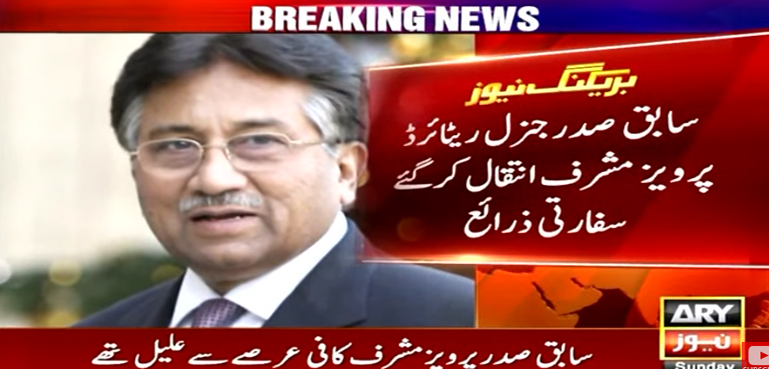 اے آر وائی نیوز کے مطابق سابق صدر جنرل ریٹائرڈ پرویز مشرف دبئی کے امریکن اسپتال میں انتقال کرگئے ہیں اور سفارتی ذرائع نے ان کے انتقال کی تصدیق کردی ہے۔