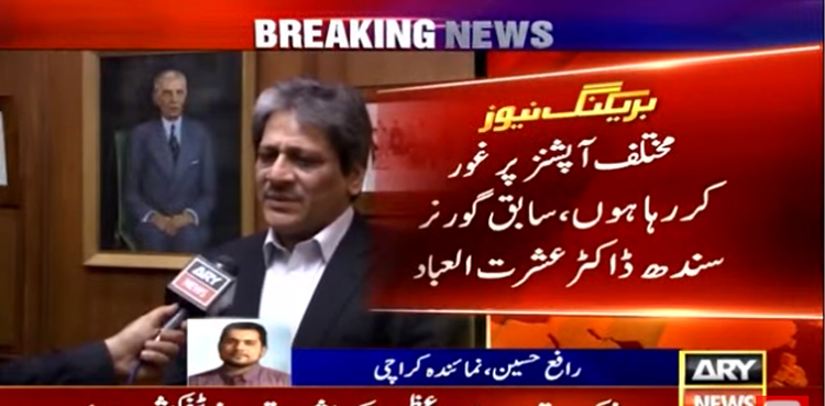تفصیلات کے مطابق دبئی میں مقیم سابق گورنر سندھ ڈاکٹر عشرت العباد خان نے اے آر وائی نیوز سے خصوصی گفتگو کرتے ہوئے کہا ہے کہ کراچی اور پاکستان میں مختلف اسٹیک ہولڈرز سے رابطے میں ہوں اور مختلف آپشنز پر غور کررہا ہوں۔