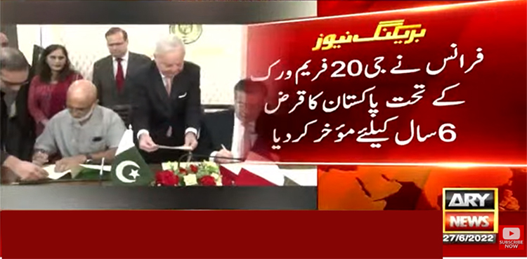 پاکستان اور فرانس کے درمیان 107 ملین ڈالر کا قرضہ مؤخر کرنے کا معاہدہ طے پا گیا۔ پاکستان کا قرض 6 سال کیلئے مؤخر کیا گیا ہے۔