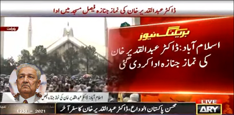 محسن پاکستان کی نمازجنازہ فیصل مسجد اسلام آباد میں سہ پہر ساڑھے تین بجے ادا کی گئی، مرحوم کی تدفین ایچ 8 قبرستان میں کی جائے گی۔