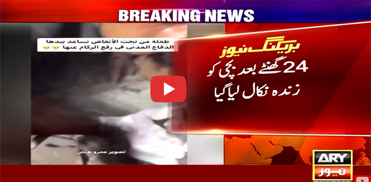 غزہ میں اسرائیلی بمباری سے تباہ شدہ عمارت سے چودہ گھنٹے بعد بچی کو زندہ نکال لیا گیا. ریسکیو ورکرز نے بچی کو کئی گھنٹوں کی کوششوں کے بعد نکالا۔