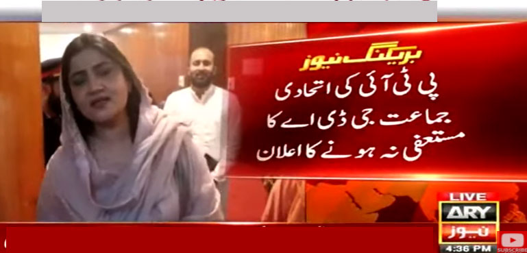 اے آر وائی نیوز کے مطابق پی ٹی آئی کی اتحادی جماعت جی ڈی اے نے قومی اسمبلی سے مستعفی نہ ہونے کا اعلان کیا ہے اس حوالے سے جی ڈی اے کی ایم این نے سائرہ بانو نے میڈیا سے گفتگو کی ہے۔